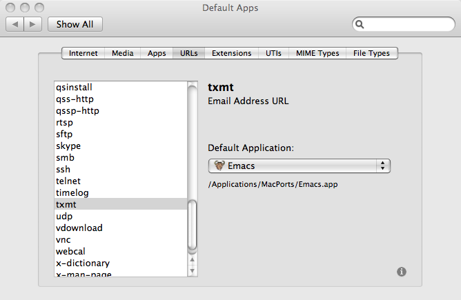 Then navigate to the Urls tab and select Emacs as the handler for txmt urls, if this hasn’t happened automatically already.