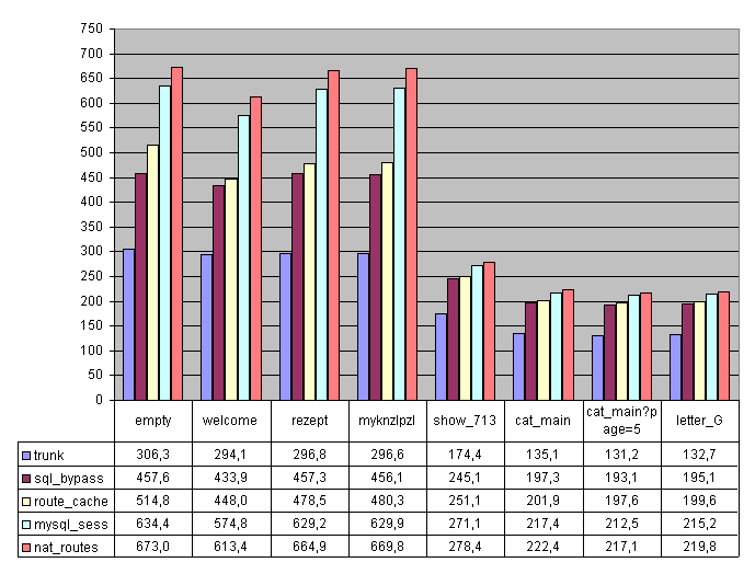 Each test was run using railsbench on an Athlon64 3000+ with 1G of memory using Suse9.3, ruby 1.8.2 and Mysql 4.1, with RAILS_PERF_RUNS=5. For session storage, Mysql using mysql-ruby-2.7 was employed and Rails logging was disabled.