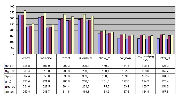 page c1 total c2 total c1 r/s c2 r/s c1 ms/r c2 ms/r c1/c2 /empty/index 1.26111 1.40676 793.0 710.9 1.26 1.41 0.90 /welcome/index 1.41814 1.57333 705.1 635.6 1.42 1.57 0.90 /rezept/index 1.50077 1.66533 666.3 600.5 1.50 1.67 0.90 /rezept/myknzlpzl 1.49374 1.65309 669.5 604.9 1.49 1.65 0.90 /rezept/show/713 3.59988 3.99798 277.8 250.1 3.60 4.00 0.90 /rezept/cat/Hauptspeise 4.54024 4.86669 220.3 205.5 4.54 4.87 0.93 /rezept/letter/G 4.59054 4.84387 217.8 206.4 4.59 4.84 0.95
